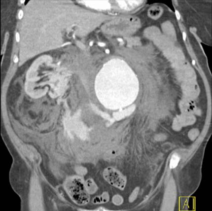 A CT scan showing a ruptured abdominal aorta.