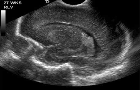 Vista lateral: ultrasonido del cerebro en recién nacido. Frente a la izquierda y parte atrás del cráneo a la derecha.