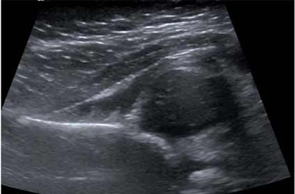 Ultrasonido mostrando cadera dislocada—cabeza de fémur fuera de alineamiento con la cuenca de la cadera.