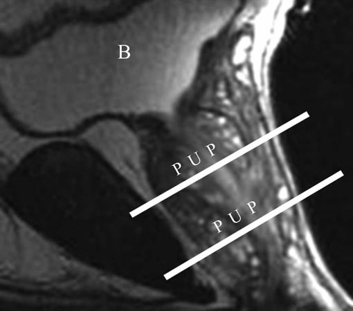 Imagen por RMN a través del centro de la pelvis de un hombre vista desde el costado. La vejiga (B) se ve en la parte superior de la imagen.